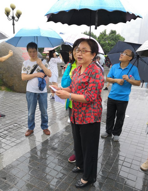 在橘子洲头,中国近现代史纲要老师刘清教授进行了现场教学。刘教授在青年毛泽东雕像前冒雨为学生讲解了《沁园春·长沙》写作背景、深刻含义和诗人饱满的爱国忧国情感,号召大学生要有“到中流击水、浪遏飞舟”的情怀和信心。