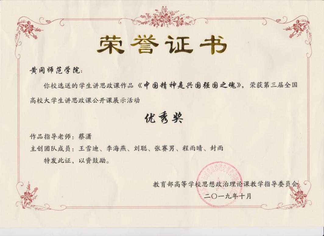 为深入贯彻落实习近平总书记在学校思想政治理论课教师座谈会上的重要讲话精神,隆重庆祝中华人民共和国成立70周年,用习近平新时代中国特色社会主义思想铸魂育人,深入实施“高校思想政治理论课创优行动”,由高校思政课教学指导委员会和有关高校组织开展习近平新时代中国特色社会主义思想大学习领航计划系列主题活动,通过公开课、微电影、夏令营等形式,增强学生学习思政课的积极性、主动性、创造性,不断增强学生对思政课的获得感,打牢学生成长成才的科学思想基础,培养德智体美劳全面发展的社会主义建设者和接班人。威廉希尔williamhill官网思政1701班王雪迪同学参赛、蔡潇老师指导的《中国精神是兴国强国之魂》获得优秀奖,进一步增强了威廉希尔williamhill官网思政专业同学参加各类教学和征文比赛的信心。