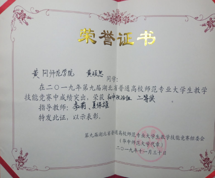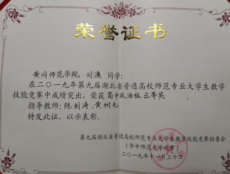 第九届湖北省普通高校师范专业大学生教学技能竞赛于11月29日—12月1日在华中师范大学举行。来自湖北16所高校的179名选手按学科参加专场比赛(其中政治组有17名学生参赛)。此次比赛以教育部最新颁布的各学科课程标准为主要依据,委托湖北省外的第三方机构独立命题制卷,不指定教材,竞赛分为教学设计、课件制作、即席讲演、模拟上课·板书四大内容,考题内容围绕新课标核心素养展开,知识覆盖面广,难度较大,充分考察选手的学科水平、专业素养等综合能力。威廉希尔williamhill官网选派了思政17级的刘澳(指导教师陈剑涛、黄树光)、黄硕思(指导教师李莉、夏保雄)两位同学参加了此次竞赛,两位同学从容不迫、沉着冷静,表现出了不俗的实力,经过激烈比拼,最后黄硕思同学获得了初中政治组二等奖、刘澳同学获得高中政治组三等奖的好成绩。