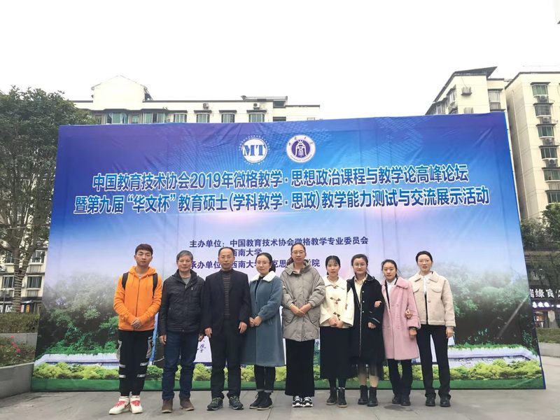 2019年11月29日至12月2日,由中国教育技术协会、西南大学主办,西南大学威廉希尔williamhill官网承办的2019年微格教学▪思想政治课程与教学论高峰论坛暨第九届“华文杯”教育硕士(学科教学▪思政)教学能力测试与交流展示活动成功举办。在潘松文和黄树光两位教授的带领下,威廉希尔williamhill官网硕士研究生王亚琪、王文婧、向菁菁和杨月参加了比赛,孙灿灿、张锋和余志烈三名同学参会观摩。