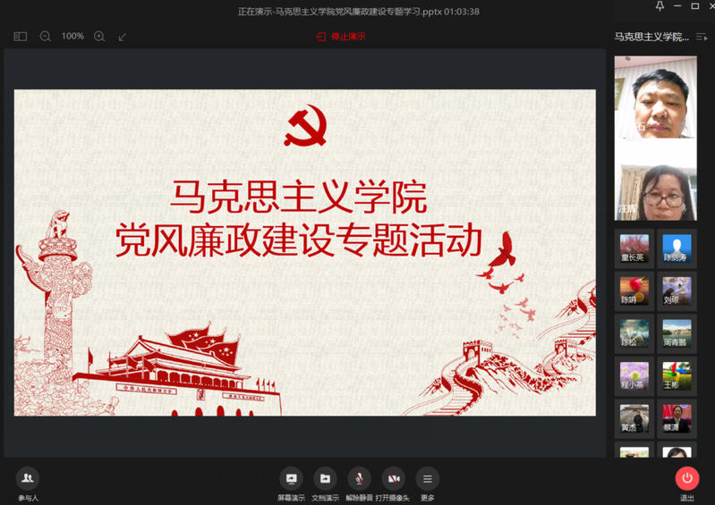 汪辉首先领学了中共中央办公厅发布《关于持续解决困扰基层的形式主义问题 为决胜全面建成小康社会提供坚强作风保证的通知》,要求持续解决形式主义突出问题,深化拓展基层减负工作,坚持标准不降、力度不减,为决胜全面建成小康社会、决战脱贫攻坚提供坚强作风保证。党课引用了大量的案例,结合高校实际,梳理高校教师可能面临的主要廉政风险,要求全员教职工警钟长鸣,严守纪律红线。党课还通过对照贯彻落实、履职尽责、服务师生、基层减负几个方面,列举出学校不同程度存在形式主义官僚主义的问题,并深刻剖析原因,提出解决方案。她强调,马院一定要高站位对待、高标准谋划、硬举措推进,必须将整治形式主义、官僚主义作为检验“两个维护”的“试金石”,切实扛牢政治责任;将整治形式主义、官僚主义作为松绑减负的“突破口”,聚焦解决突出问题;将整治形式主义、官僚主义作为引领实干的“助推器”,标本兼治抓常抓长。领导和上级要身体力行、以上率下,真正把求真务实、真抓实干的风气树起来,把力戒空谈、崇尚实干的导向立起来,为敢于担当、苦干实干者鼓劲撑腰,不断深化巩固整治成果,健全完善长效机制,更好地激励广大干部担当作为。