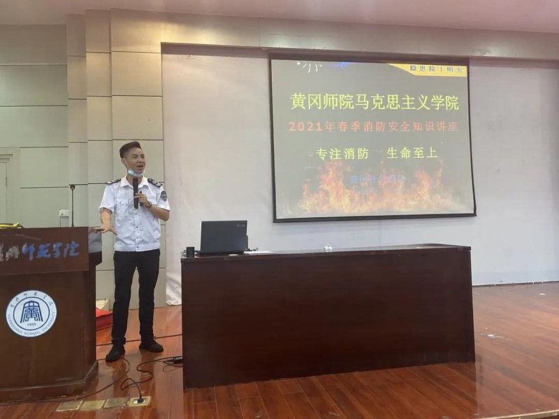 黄冈市社安消防中心李立翔教官向大家宣讲关于消防的各种安全防范知识,通过列举了大量生活中的真实案例,警示大家要注意和重视消防安全问题,教训深刻,发人深省。然后,他还向广大师生讲述了火灾发生后正确的逃生方式,并且实践指导和展示了灭火器,灭火毯的正确使用,以及在不同场合使用不同的灭火工具。