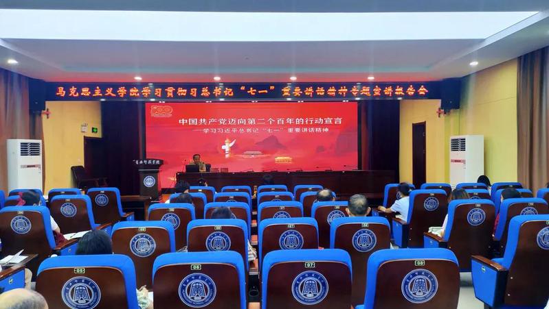 为深入学习宣传贯彻习近平总书记在庆祝中国共产党成立100周年大会上的重要讲话精神,推动党史学习教育深入开展。9月16日下午,威廉希尔williamhill官网于致远楼学术报告厅举行学习贯彻习近平总书记“七一”重要讲话精神专题宣讲报告会,学院特邀黄冈师范学院政法学院院长李红卫教授作专题报告,党总支书记汪辉主持宣讲会。威廉希尔williamhill官网全体教师、研究生、本科生学生代表聆听宣讲。