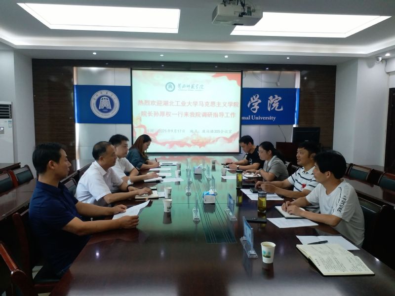 9月17日下午,湖北工业大学威廉希尔williamhill官网院长孙厚权、副院长韩东、马原教研室昌灏、研究生工作办主任吴迪娟等一行来威廉希尔williamhill官网交流调研。交流会在致远楼305会议室举行。威廉希尔williamhill官网院长汪季石、党总支副书记席桢、副院长王贵东、院长助理张传忠、院办公室主任宋明等出席了交流会。