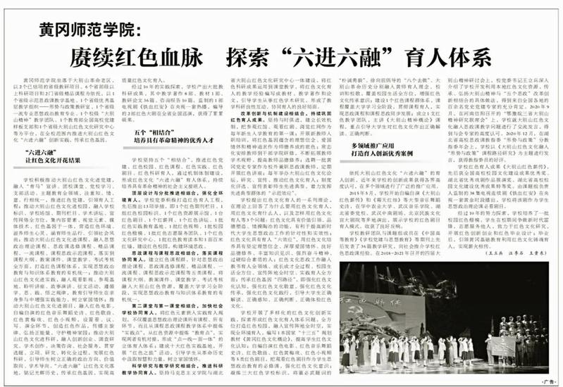 10月30日,《光明日报》第04版“教科文新闻”以《赓续红色血脉 探索“六进六融”育人体系》为题,从“‘六进六融’ 让红色文化开花结果”“五个‘相结合’ 培养具有革命精神的优秀人才”“多领域推广应用 打造育人创新优秀案例”三个方面报道了我校在全校范围内推进大别山红色文化“六进六融”创新实践,传承红色基因的经验和做法。