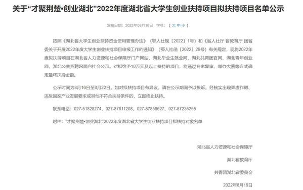“湖北省大学生创业扶持项目”每年经学生申请、学校推荐、省市人社部门审核,在全省评选一批优秀大学生创业项目,给予不同金额的无偿资金扶持,今年将扶持资金金额提高至5万至50万元,旨在全力推进“大众创业、万众创新”,深入实施“才聚荆楚”工程,鼓励和扶持更多大学生在鄂创新创业。