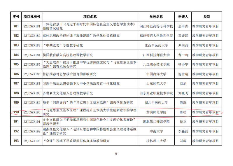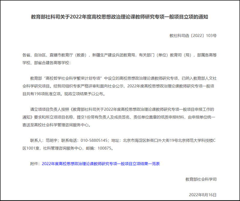 近日,教育部社科司发布了《关于2022年度高校思想政治理论课教师研究专项一般项目立项的通知》,共有198项批准立项。威廉希尔williamhill官网陈松博士主持申报的教学研究青年项目《“马克思主义基本原理”课程提升艺术类大学生创新意识的学理研究》喜获立项,项目编号:22JDSZK190。