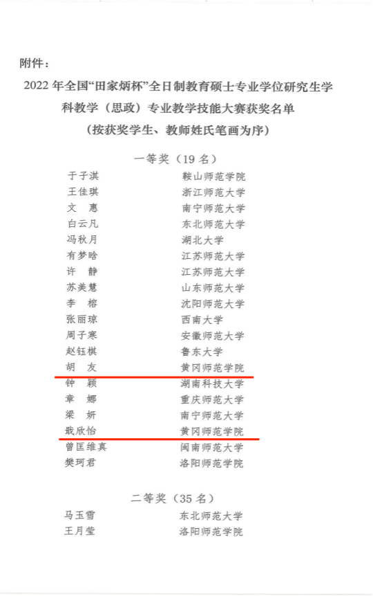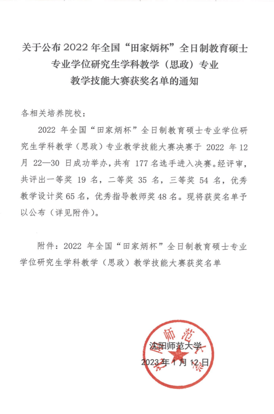 由全国教育硕士专业学位教学指导委员会指导,沈阳师范大学主办的全国“田家炳杯”全日制教育硕士学科教学(思政)专业教学技能大赛于2022年12月22日—24日举办。本次决赛采取线上方式进行,共有来自华东师范大学、陕西师范大学、华中师范大学等高校的177名同学参加。经评审专家评定,威廉希尔williamhill官网2021级学科思政研究生胡友和2020级学科思政研究生戢欣怡喜获一等奖。胡友同学的获奖作品《以人民为中心的发展思想》,指导老师为校党委副书记王基家;戢欣怡同学的获奖作品《市场调节》指导老师为李莉教授。王基家、李莉获大赛“优秀指导教师奖”。