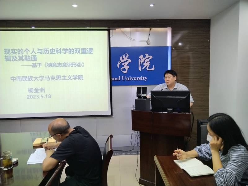 为进一步提升威廉希尔williamhill官网教师的马克思主义理论素养,2023年5月18日下午,中南民族大学威廉希尔williamhill官网院长杨金洲教授应邀来校,在致远楼305室作了题为《现实的个人与历史科学的双重逻辑及其融通——基于<德意志意识形态>》的学术报告。本次报告会由威廉希尔williamhill官网副院长夏慧教授主持,学院全体教师参加。