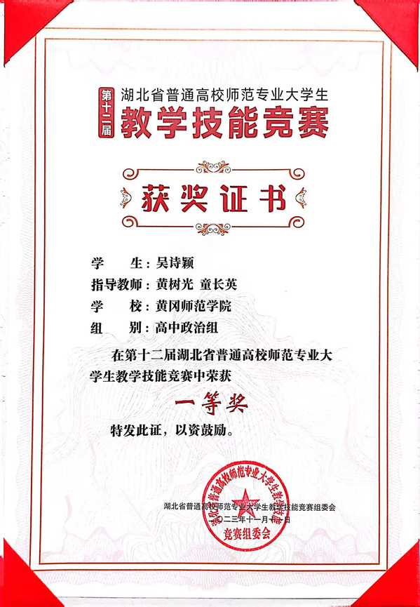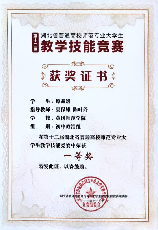 11月10---11日,第十二届湖北省普通高校师范专业大学生教学技能竞赛决赛在华中师范大学进行,来自全省13所院校的65名不同学科的优秀学子齐聚桂子山,切磋技艺,展示风采。其中政治组一共有6名选手参加现场决赛,威廉希尔williamhill官网思政专业21级谭鑫媛、吴诗颖两位同学经过激烈比拼,分别荣获初中政治组、高中政治组一等奖的好成绩。