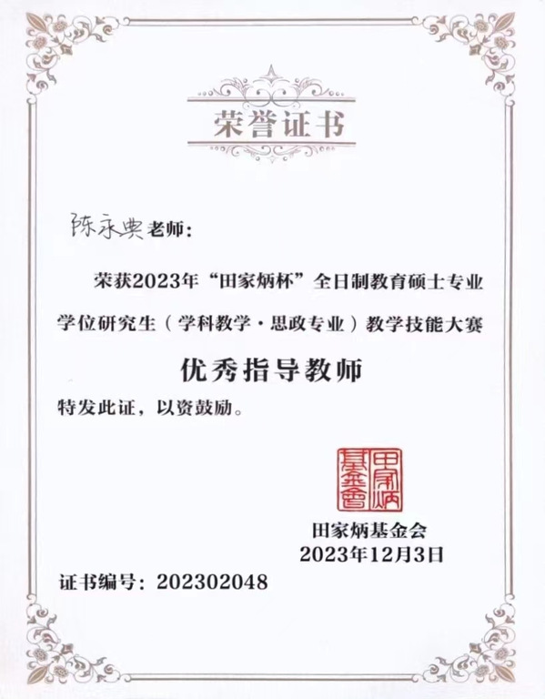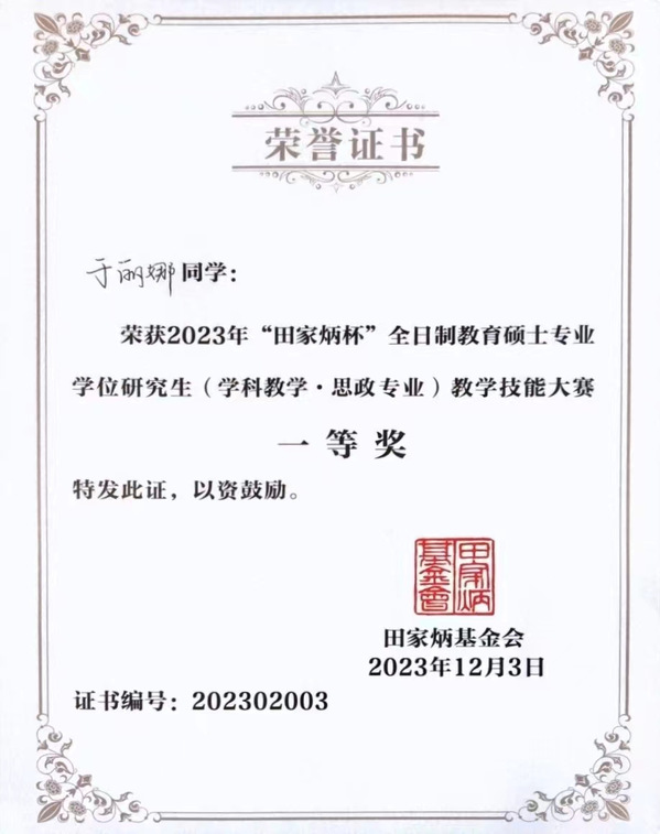 我校威廉希尔williamhill官网2021级学科教学(思政)专业于丽娜在2023年全国“田家炳杯”全日制教育硕士专业学位研究生学科教学(思政)教学技能大赛中荣获一等奖,陈永典老师获评优秀指导教师奖。