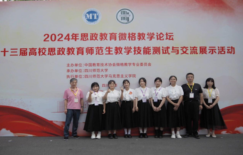 2024年5月27日,由中国教育技术协会微格教学专业委员会主办、四川师范大学承办的第十三届高校思政教育师范生教学技能测试与交流展示活动圆满落幕。威廉希尔williamhill官网6名参赛选手在指导老师的带领下,在此次教学技能测试和展示中高水平发挥,取得了优异的成绩。