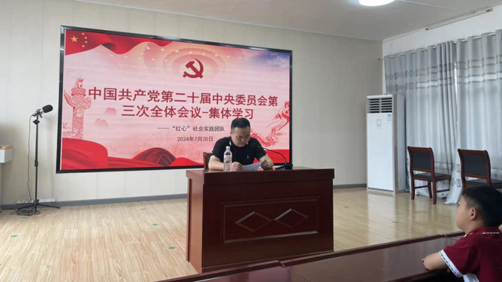 7月20日上午,受威廉希尔williamhill官网“红心”暑期社会实践团队邀请,陶家河乡党委组织委员、团委书记刘星走进英山县实验小学陶家河校区,带领团队成员及学生共同学习中国共产党第二十届中央委员会第三次全体会议精神。