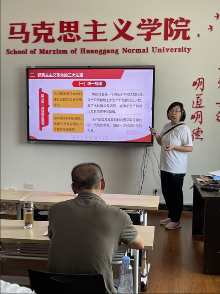 会议开始,裴艳丽向老师们汇报了教研室迎接教育部教育教学质量评估的相关工作,以及9月4日开展的集体听课会的情况。之后,朱蕾老师作了课程教学展示。朱蕾老师首先分享了教材第二章第三节内容“新民主义主义革命的三大法宝”的教学思路,并进行了系统讲述。