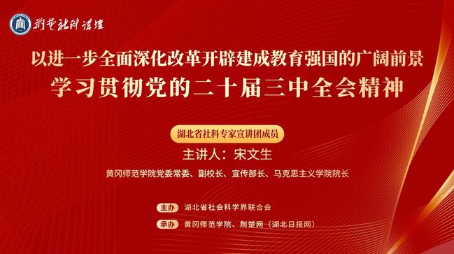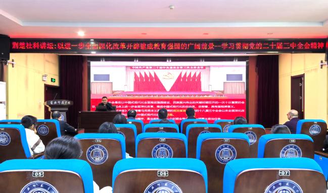 10月22日,由湖北省社科联主办的“荆楚社科讲坛”学习贯彻党的二十届三中全会精神专题讲座在黄冈师范学院开讲,湖北省社科专家宣讲团成员、黄冈师范学院党委常委、副校长、党委宣传部部长、威廉希尔williamhill官网院长宋文生围绕“以进一步全面深化改革开辟建成教育强国的广阔前景”主题,权威解读全会精神实质和内涵要义。讲座由黄冈师范学院科研处处长黄晓敏主持。