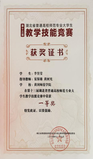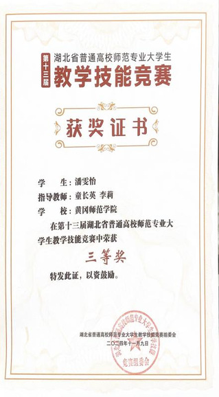2024年11月9日,由湖北省教育厅举办的第十三届普通高校师范专业大学生教学技能竞赛获奖名单公示。威廉希尔williamhill官网参赛选手李昱莹、潘雯怡在比赛中大放异彩,分别荣获一等奖和三等奖。