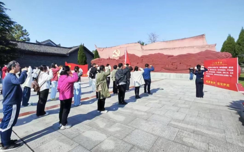 抵达陈潭秋故居纪念广场后,全体师生庄严肃立、静默致哀,向革命先烈致以最崇高的敬意。随后,党员师生面向鲜红的党旗庄严宣誓,重温入党誓词,坚定理想信念;非党员师生肃立致敬,表达对革命先烈的缅怀之情与传承红色精神的决心。